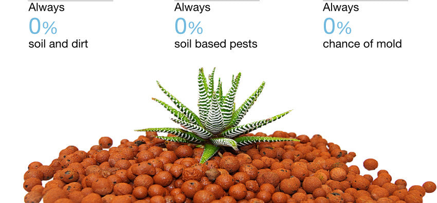 HappyGrün plants are hydroponically cultivated, this means they grow 100% without the use of soil and dirt. The porous nature of the expanded clay aggregate used in the HappyGrün Plant System optimizes the flow of oxygen through the roots where most of the air cleaning takes place. And since plants produce negative ions which attach to and remove particles such as dust, mold, bacteria, and allergens, the HappyGrün Plant System is perfect to clean and humidify your air and to help you live a happier and healthier life.