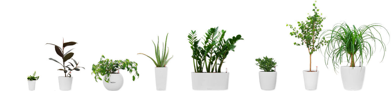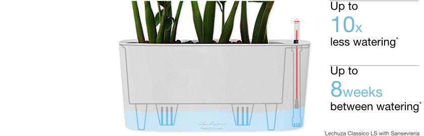 Each planter is equipped with an internal water reservoir. Depending on the type and style of the planter, the amount of water housed in the reservoir varies. Some planters have a reservoir as big as 27 liters [7 gallons]. But regardless of what planter you choose, it can be weeks, and even months between watering. So don’t worry about asking family and friends to water your plants next time you are out of town.