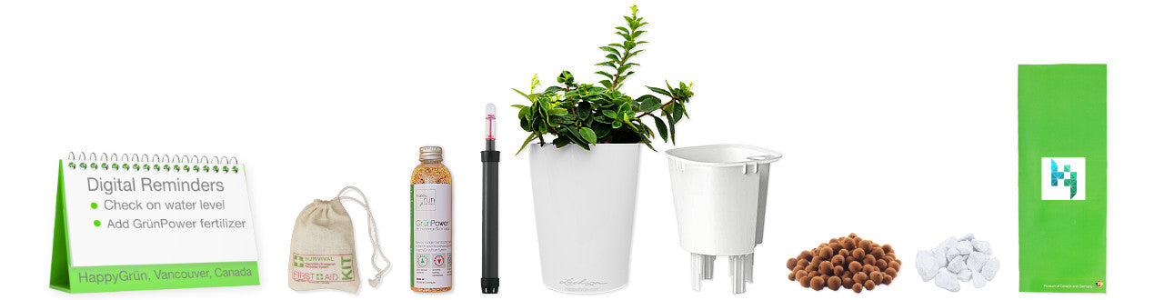 Every new HappyGrün Plant System comes with a specially cultivated plant of your choice, cultivating pot, outer planter, water indicator, expanded clay aggregate, decorative toppings, one year supply of ion-exchange fertilizer, first aid kit, plant biography, detailed instructions, digital reminders, a one year HappyGrün Care Protection Plan, and a whole lot of love and happiness.